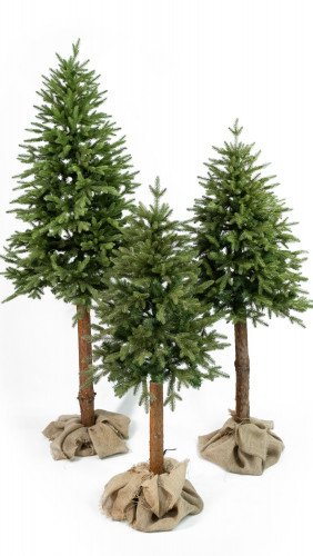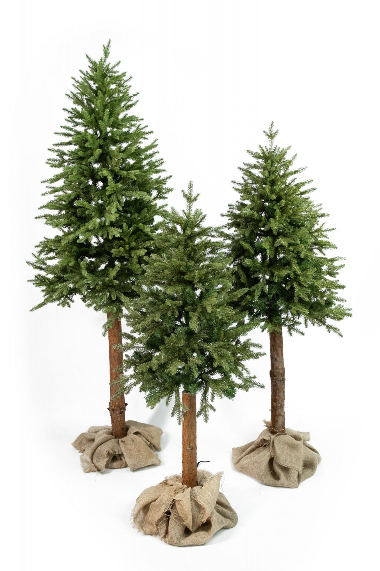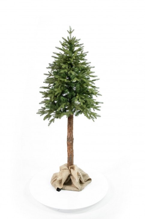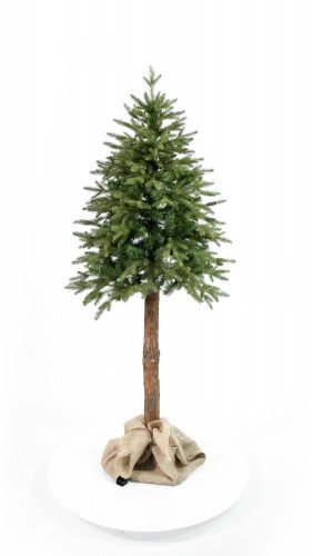 otoczenia. Choinka osadzona jest na naturalnym drewnianym pniu przytwierdzonym do drewnianego stojaka, który dla dodatkowego efektu opleciony jest jutową chustą.