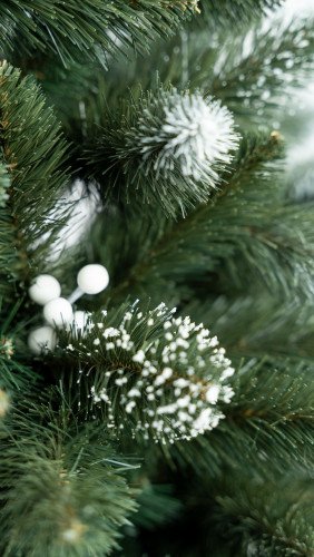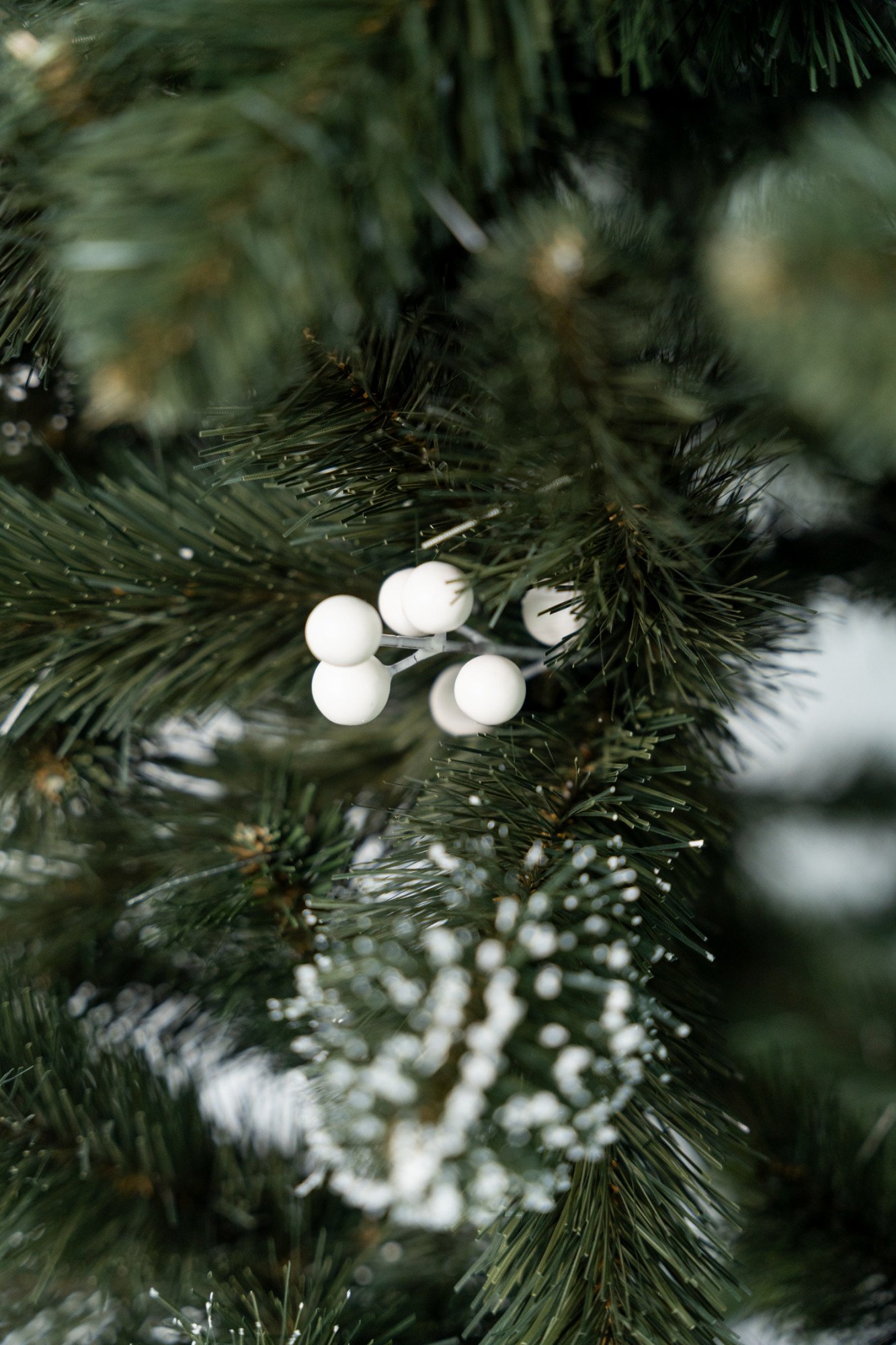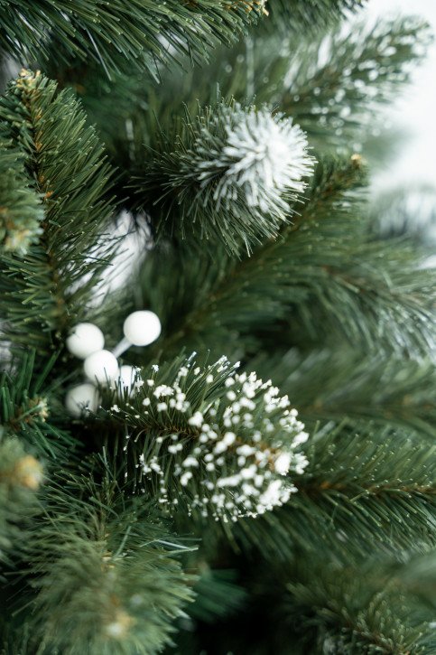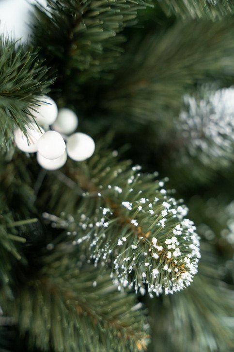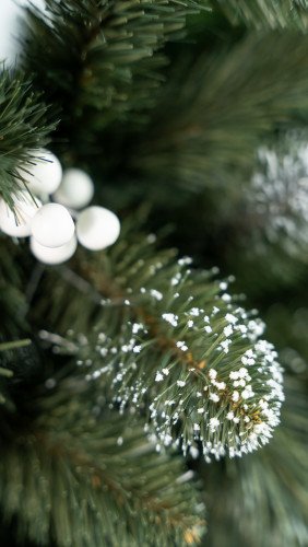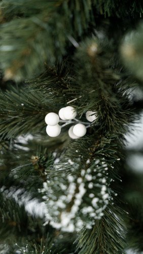 Sosna Perłowa należy do kategorii choinek ekskluzywnych. Przy rdzeniu gałązki znajduje się brązowy przeplot krótkich brązowych igieł. Dłuższe igły są w kolorze jednolitej ciemnej zieleni. Gałązki Sosny Perłowej ścięte są w ołówek. Część z nich na zakończeniu pomalowana jest białą farbą, a część ozdobiona jest szkłem dekoracyjnym z białą farbą. Dodatkowym atutem Sosny Perłowa są gałązki srebrnych kulek.